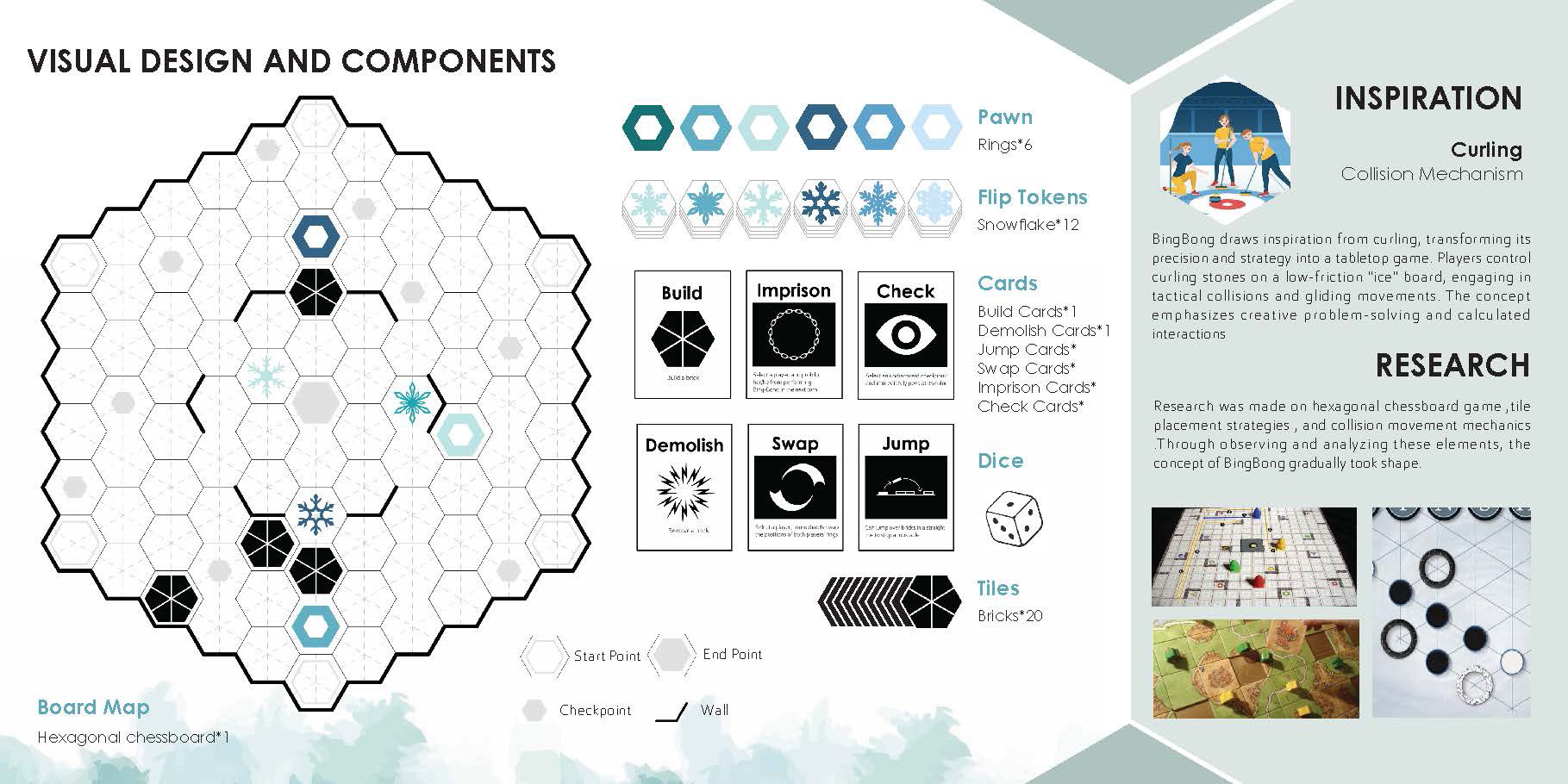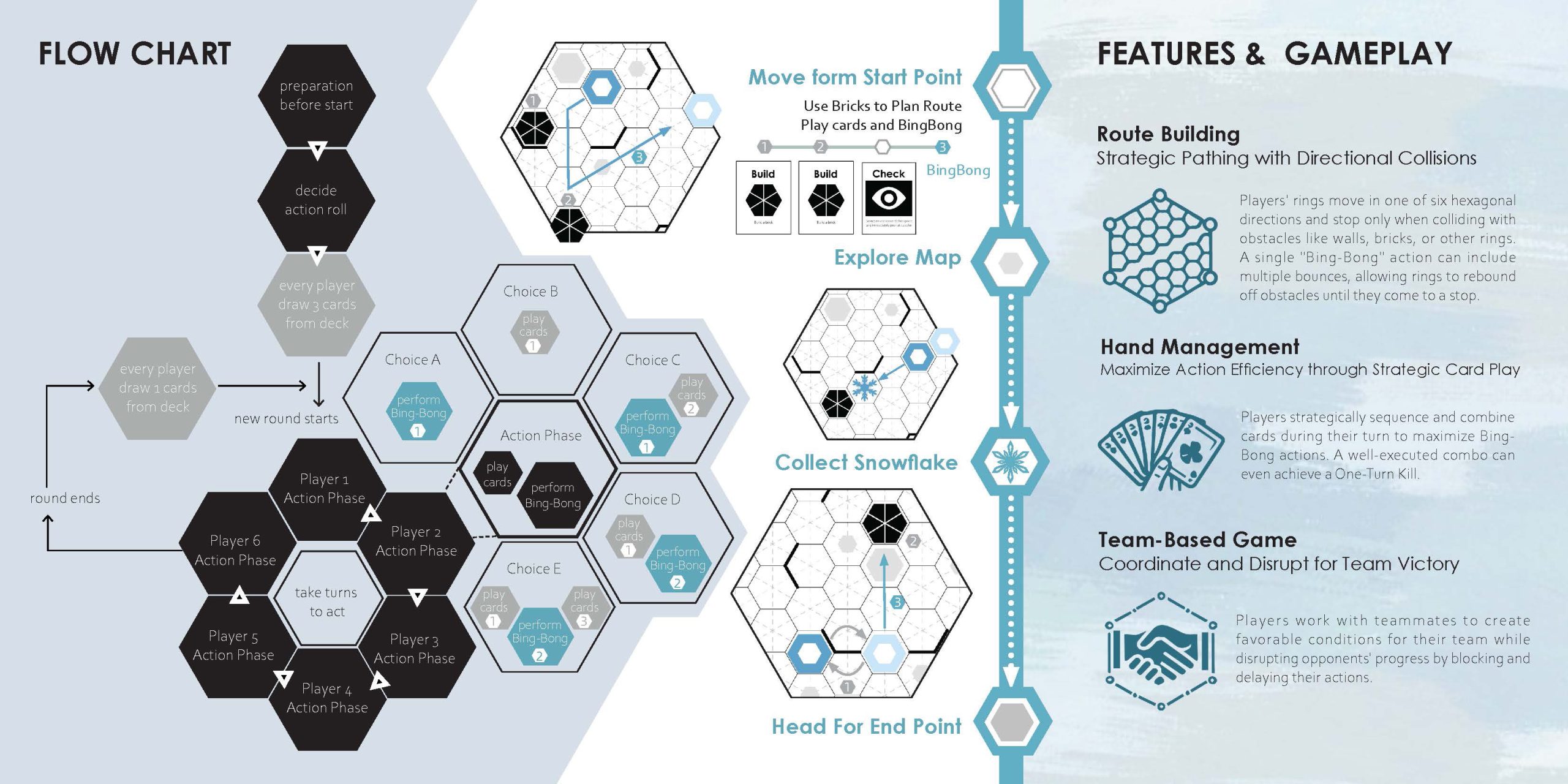 Bing-Bong is a turn-based strategy board game centered around route building. The game supports 3-6 players, with the map dynamically changing in real-time based on player interactions. By constructing paths and placing obstacles, each match is full of strategic depth and variety, simulating the collisions of curling on paper and offering players an ever-changing competitive experience.