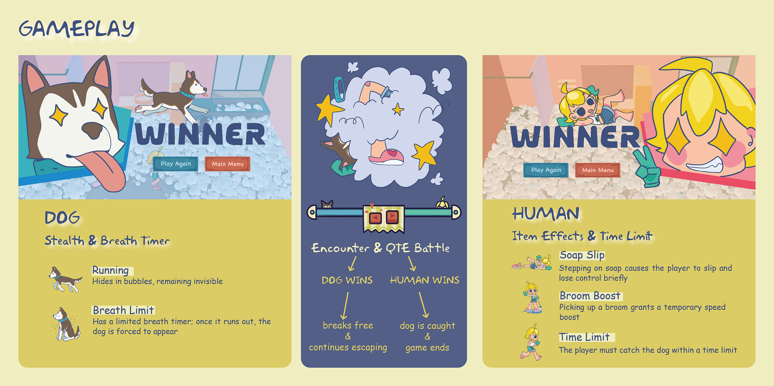 One player becomes the Dog, desperately avoiding bath time. The other becomes the Owner, determined to catch them and bring order back.