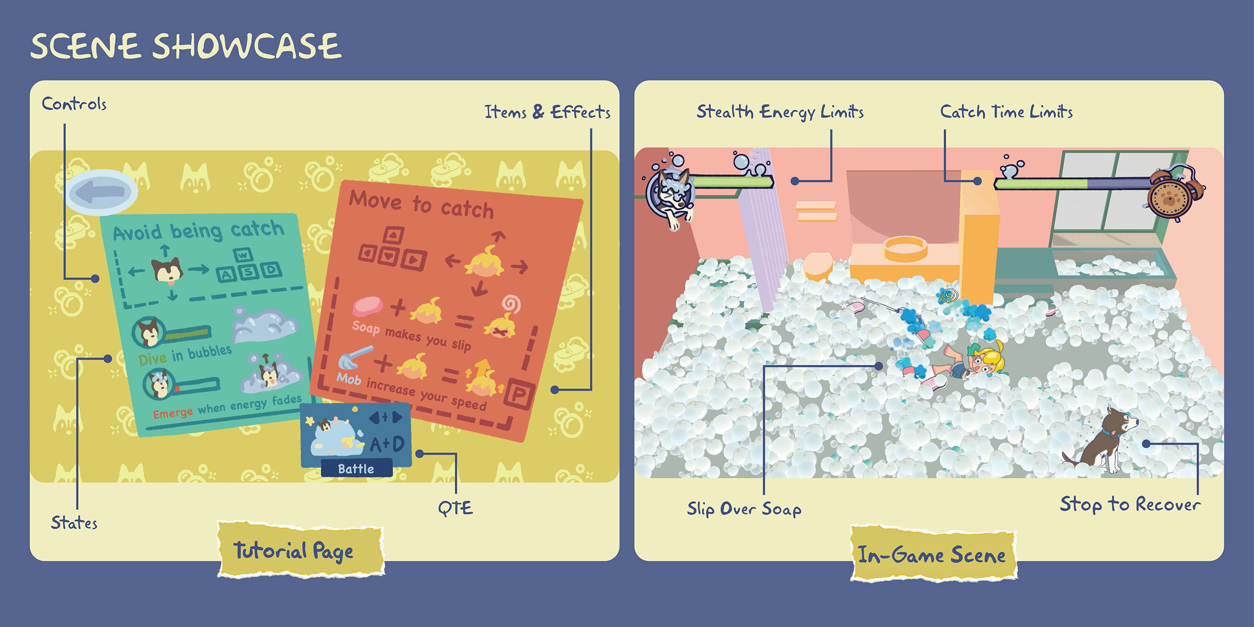 The match unfolds in a bubble-filled arena where movement is constantly disrupted. Bubbles provide temporary hiding and escape opportunities, while soap on the ground adds unpredictable slipping hazards that shift the momentum of the chase.